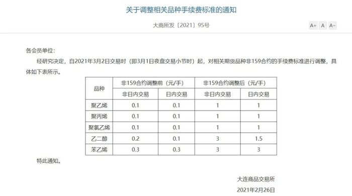 2月26日,大商所发布《关于调整相关品种手续费标准的通知》(以下简称《通知》),《通知》中调整了聚乙烯、聚丙烯等五个化工品种非159合约的交易手续费标准,调整幅度为10—15倍,调整幅度最大的是乙二醇非159合约交易手续费标准,幅度为15倍。