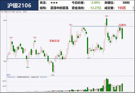 近期美国经济恢复超预期,受到美债收益率上涨的打压,贵金属大幅下挫。今日盘中大幅走弱,暂时没有空头策略,上方关键预警位仍参考5880,暂时观望。