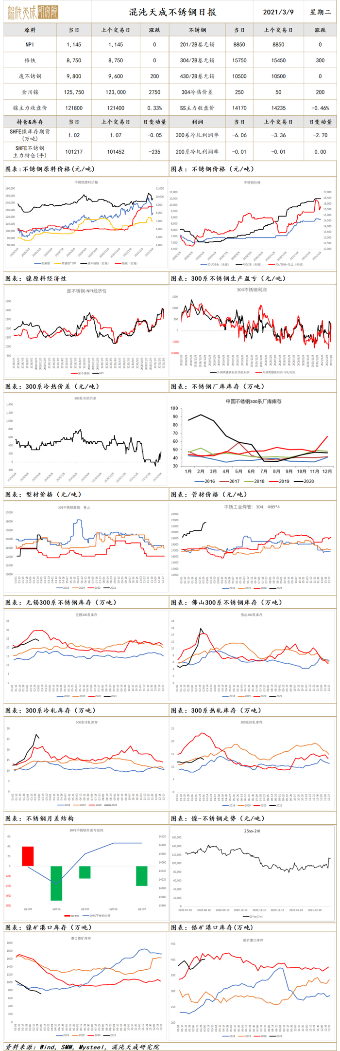 青山NPI转产高冰镍将镍定价两条分化线路再度融合,Ni与NPI的联动性预期回归。但从转产成本上来看,Ni与NPI至少应保持2500美元/吨的溢价。菲律宾雨季结束前,矿库存持续下降,叠加海运费上涨,国内矿价坚挺。而印尼镍矿内贸基准价上行趋势确定性较强,所以NPI价格下行压力不大,在现有溢价水平基础上扩大以镍价上涨更为确定。钢厂生产成本重心短期下移,但长期来看,仍是走高趋势。统计数据显示,3月不锈钢排产创单月新高,钢厂接单较为乐观,且不锈钢社会库存开始下降,现货价格坚挺,300系冷轧上调300元/吨,基差再处高位,盘面有上行空间。