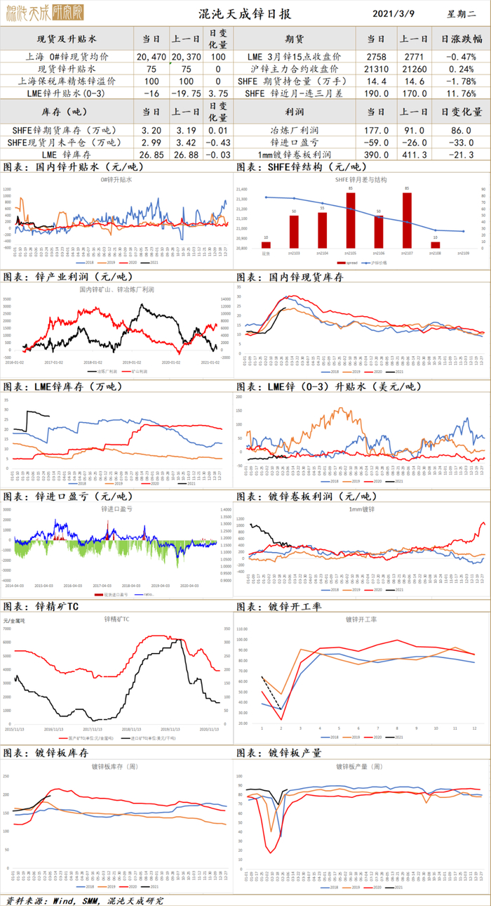 1、8日中国锌锭总库存23.99万吨,较(3/4)下跌0.26万吨,较(3/1)增加0.10万吨;上海8.29万吨;广东4.42万吨;天津9.37万吨,山东0.74万吨;浙江0.76万吨;江苏0.41万吨。(Mysteel)