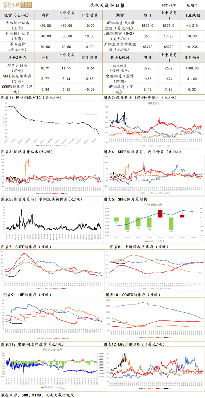 尽管美国财政部1.9万亿刺激方案参众两院议院均已通过,但基本是市场预计以内,市场反馈平淡,中长期美债持续上行,美元走强,对铜价形成压制,昨日铜价偏弱震荡运行。