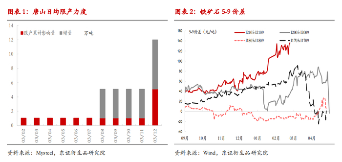 3月份以来,唐山环保限产力度愈发趋严,市场从初期对政策执行力度的质疑分化,到限产事实扩大后情绪快速恶化。铁矿石盘面从3月中旬开始逐渐体现市场对的限产扩大化的担忧。现货短期基本面偏强,长期预期不断恶化,下跌中远月跌幅大于近月,截止3月15日,5-9价差扩大至139元/吨的历史新高。