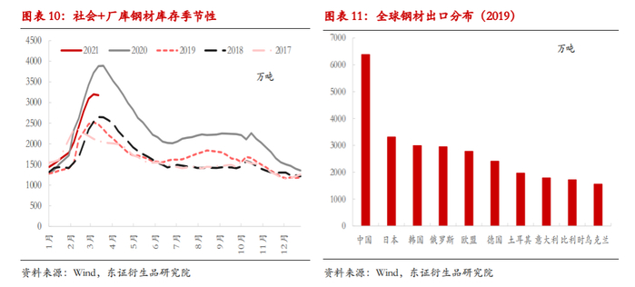 对于成材来说,产量平控最大的问题在于产量跟需求的不匹配。需求方面,根据东证钢铁年报测算,2021年钢铁需求较2020年预计增加4%,即4060万吨,折合2-12月份需求增加3500万吨。假设粗钢实现产量平控,3500万吨的需求即意味着3400万吨的成材缺口。国内成材缺口主要通过两种方式填补:一是现有钢材库存;二是减少净出口。