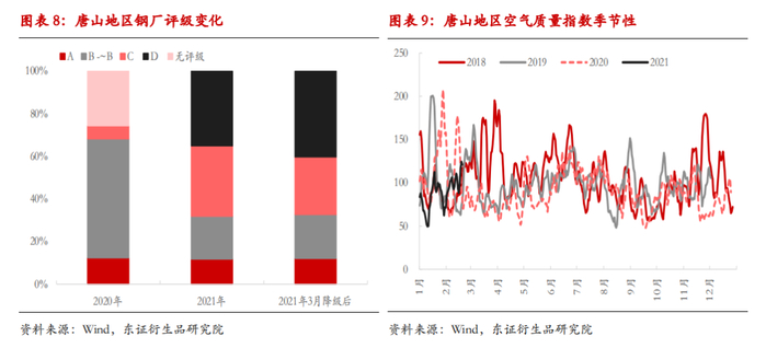 不过,这里的唐山减产估算存在较大不确定性。一是,唐山环保检查异常严格,多家钢企年后均被下调评级,潜在可限产最大规模在扩大;二是,减排指南限产条件取决于天气污染,该因素不可控;三是,唐山3月份的环保攻坚之后是否回归常态化限产。对于唐山地区,我们预计可能有两个时间节点可以关注:一是4月初,3月份环保攻坚结束之后,4月份政策如何变化;二是7月份,建党100周年前后,实际政策执行变化。
