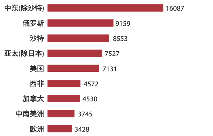 根据《BP世界能源统计年鉴2019》,国际石油主要进口国家/地区为欧洲、美国和中国。国际石油主要出口国家/地区为中东和俄罗斯及前苏联地区。具体进口量与出口量见下图。