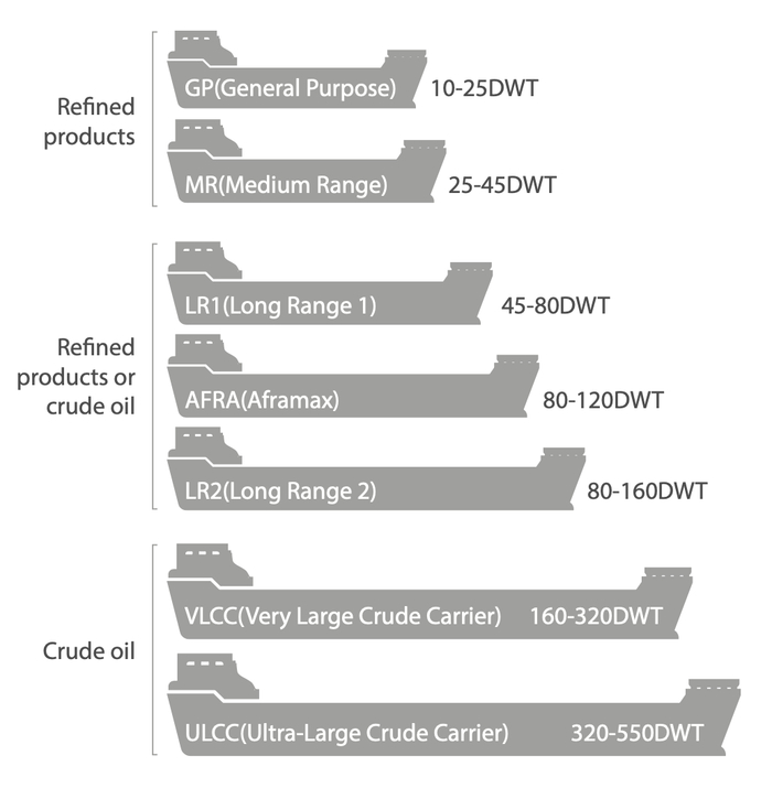 基于AFRA(运费费率平均运价)评估标准,油轮按载重吨位可分为小型轮General Purpose(1-2.5万吨)、中型轮Medium Range(2.5-4.5万吨)、LR1型轮(4.5-8万吨)、LR2型轮(8-16万吨)、超大型轮VLCC(16-32万吨)、巨型轮ULCC(大于32万吨)。常用的巴拿马型Panamax(5-8万吨)属于LR1型油轮,阿芙拉型Aframax(8-12万吨)和苏伊士型Suezmax(12-15万吨)属于LR2型油轮。