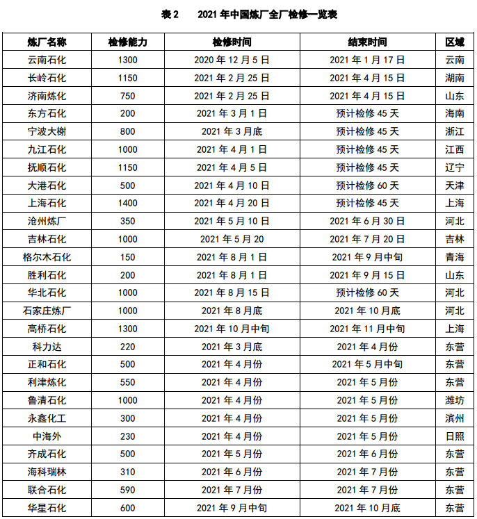 卓创资讯市场跟踪发现,与2020年一季度国内部分炼厂“被动检修”不同的是,2021年将迎来国内炼厂检修大年,主要集中在上半年进入检修期,预计主营单位检修厂家近30家,累计约1.8亿吨产能;而山东独立炼厂全年或近20家炼厂,累计约7000余万吨产能。