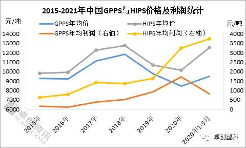 2020年全球公共卫生事件的影响,成为GPPS与HIPS走势分化的主因;2020年年内,PS市场供应增量与需求增量并不完全匹配,HIPS供应愈发趋紧,两者价差及利润差逐步扩大。