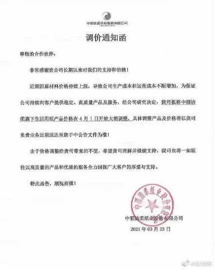 近期,维达、清风、洁柔等国内四家知名纸业公司均发布了调价通知,宣布从4月1日起将上调旗下产品价格。截至目前,市场上部分生活用纸产品价格上调了10%—20%。