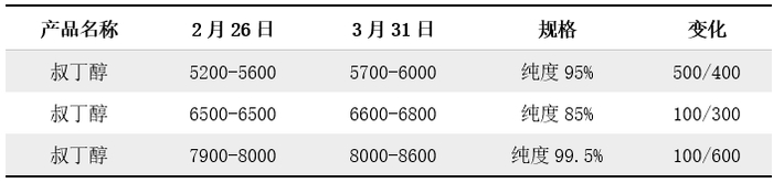 3月国内TBA市场价格整体处于涨后小幅回调的趋势。其中金陵亨斯迈装置生产正常,TBA现货偏低,现货报盘价格从5900元/吨降至5750元/吨。万华化学TBE现货供应也较紧张,考虑下游接受情绪,实单商谈价格亦有所回落。齐翔腾达因MMA装置满负荷生产,外销量依然紧张,厂家报盘价格维持在6800元/吨,但缺少实单商谈,纯度85%;。受原料叔丁醇价格维持高位的影响,无水叔丁醇报价也相对偏高,截至月底生产厂家报盘在800-8600元/吨附近,不过下游需求一般,实单商谈以一单一谈为主。