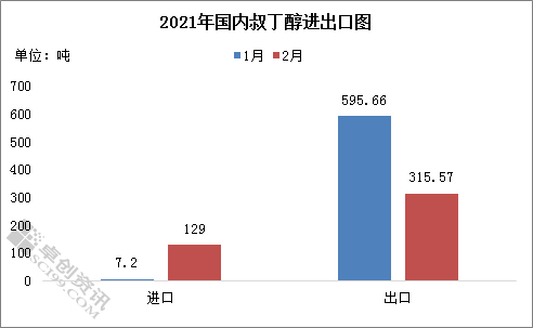 根据海关数据显示,2021年2月国内叔丁醇进口量在129吨左右,环比上涨1692%,同比下降96%;2021年2月国内叔丁醇出口量在315.57吨左右,环比下降47%,同比下降19%。
