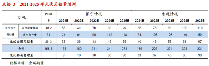 ◆结合中国光伏行业协会对2021-2025年中国以及全球光伏新增装机量的预测以及边框和支架单位GW耗铝量对未来光伏领域用铝量进行测算:保守情况下,2021-2025期间每年光伏用铝增量在8-30万吨,乐观情况下,这一数值将扩大至32-45万吨。