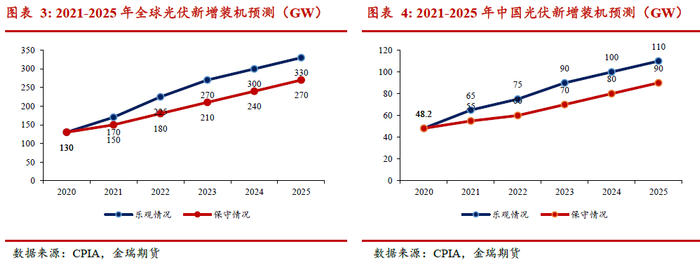在碳中和目标进一步明确的背景下,可再生能源的应用比例将不断提高,带动全球光伏发电装机量进一步提升。根据中国光伏行业协会(CPIA)预测,从2021年起全球光伏新增装机量将不断攀升,预计2021年新增装机量在150-170GW,到了2025年,这一数字将上升至270-330GW。而国内同样为加速上涨,预计2021年新增装机量为55-65GW,这一数字将攀升至90-110GW。全球光伏行业进入发展快车道。
