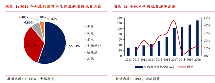 何为“碳中和”?即全社会在一定时间内产生的二氧化碳或温室气体排放量通过植树造林、节能减排等方式进行相互抵消,实现相对“零排放”,其中减排是重中之重。经过多年的研究和发展,各国寻求太阳能、风能、潮汐能等自然能源替代化石能源的使用进而减少碳排放。随着光伏技术的进步和发展,太阳能成为近年来全球新能源开发利用的“宠儿”。根据国际可再生能源机构(IRENA)的数据显示,2019年全球光伏新增装机量占所有可再生能源新增装机量的比重超过一半。