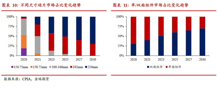 而另一大发展趋势是双面双玻组件的市场占比不断提高,双面组件即正、反面都能发电的组件,反面用光伏玻璃代替传统组件的背板,双面组件的发电效率更高,耐磨性、透水率等性能也较优。理论上讲,双面组件不需要铝合金边框进行保护,而实际上多数企业出于安全考虑仍会使用边框,但随着双面组件的市场占比越来越高,铝合金边框的使用或较当前有所减少。