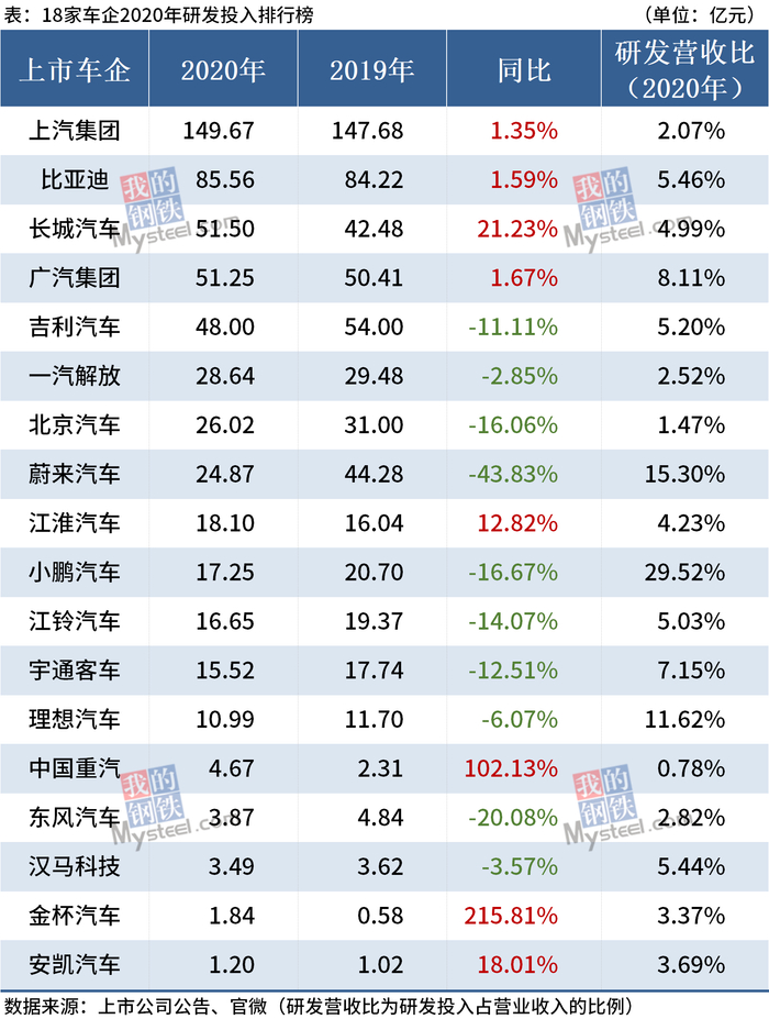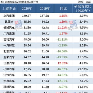 原标题:19家车企2020年研发投入排行榜:上汽超百亿元