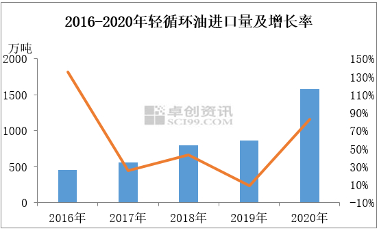 目前轻循环油暂不征收消费税,近年来贸易商以税则号27079990(蒸馏煤焦油所得的其他产品)大量进口轻循环油,进口量呈逐年递增态势,截至2020年,轻循环油的进口总量为1577万吨,较2015年189万吨增加1388万吨。