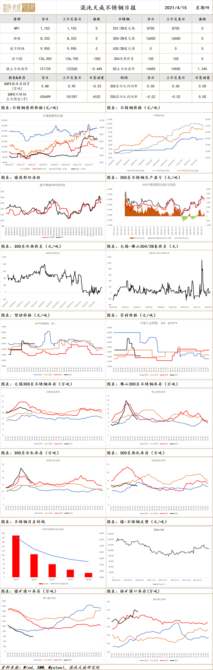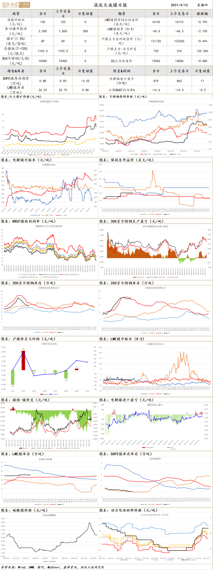 1、国内电解镍清关增势持续 保税区库存即将清零:截止4月10日最新一周进出口数据显示,上周保税库库存净增长-1110吨,总量维持在180吨。