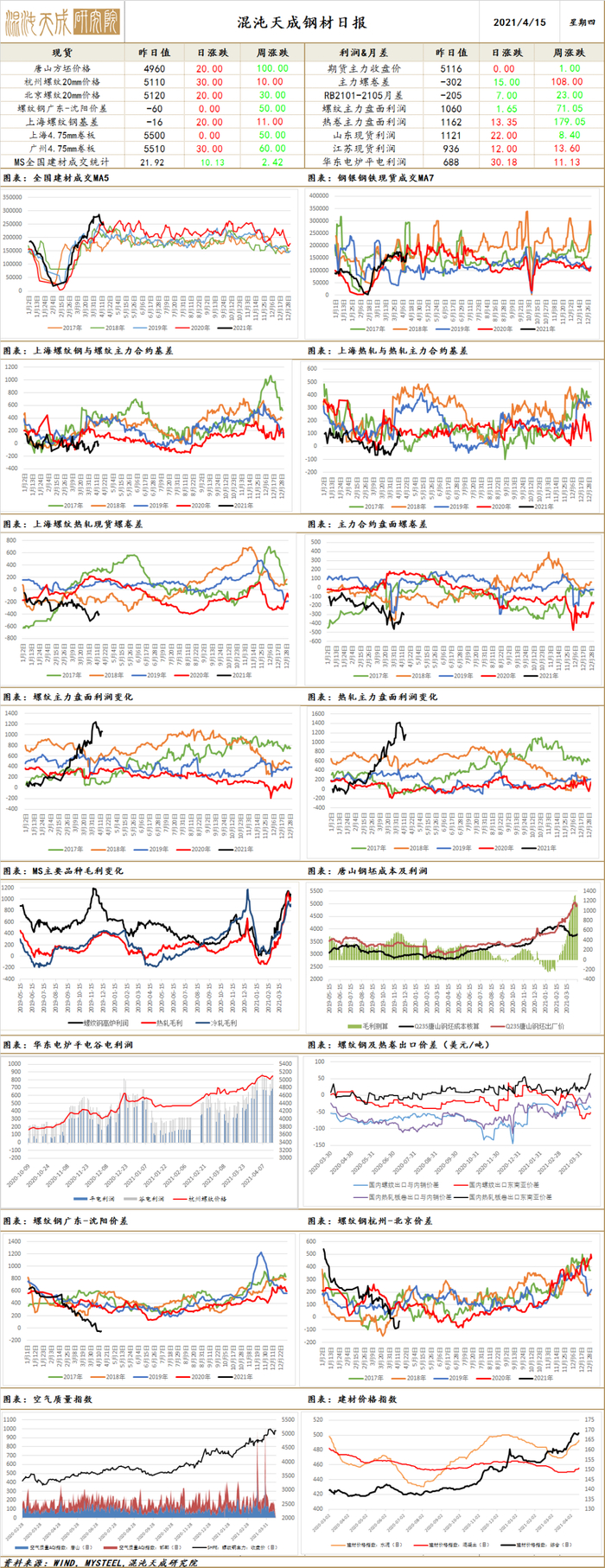 1.Mysteel:14日调研结果显示:本周唐山地区10家样本钢厂平均铁水不含税成本为3049元/吨,平均钢坯含税成本3877元/吨,周比下调16元/吨,与4月14日当前普方坯价格4940元/吨出厂相比,钢厂平均毛利润1063元/吨,周比下调104元/吨。