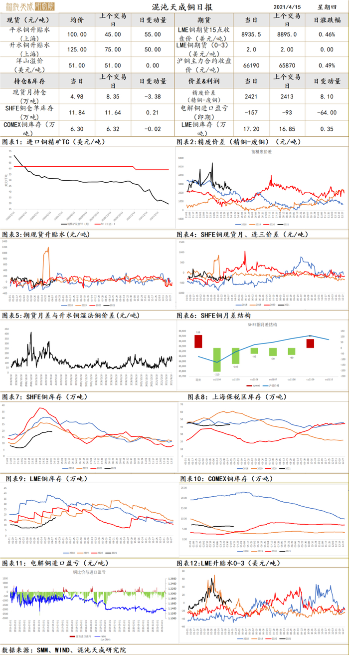5、保税区铜库存继续增加 因国内出口增多:截止4月10日当周上海保税区电解铜库存约46.3万吨,较前一周增加0.99万吨。
