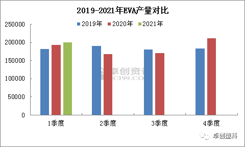 据卓创资讯统计,2021年1季度EVA国产供应量在20.07万吨,同比上涨4.36%,1-3月行业平均开工负荷在76.67%,同比提升4.01%。从具体分月数据来看,1季度产量增加部分主要集中在3月,1-2月因为LDPE/EVA装置产出减少及装置停车检修等因素,EVA产量均低于去年同期。3月份,伴随着需求小旺季来临,EVA国产供给量明显增加,同比增幅在18.96%。