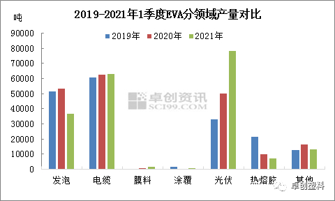 从2021年1季度EVA产品结构来看,产品结构继续保持多元化的格局,低VA货产出减少。其中光伏料产量在EVA总产量中占比最高,达39%。其次为电缆料,达31.42%。此两类产品也成为产量同比增幅最大的产品,其中光伏料产出同比上涨56.36%,电缆料产量同比增加0.6%,除此以外,膜料、涂覆占比虽小,产量也保持正增长。而发泡、热熔胶产量同比下降明显,分别下降30.74%和27.88%。