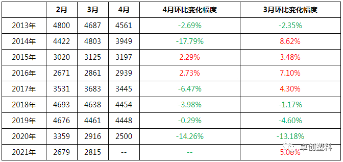 由2013-2020年近10年的历史数据对比来看,历年4月份毛瓶市场价格下行的几率较大,就目前情况来看,今年4月份毛瓶市场价格将仍呈弱势僵持走势。