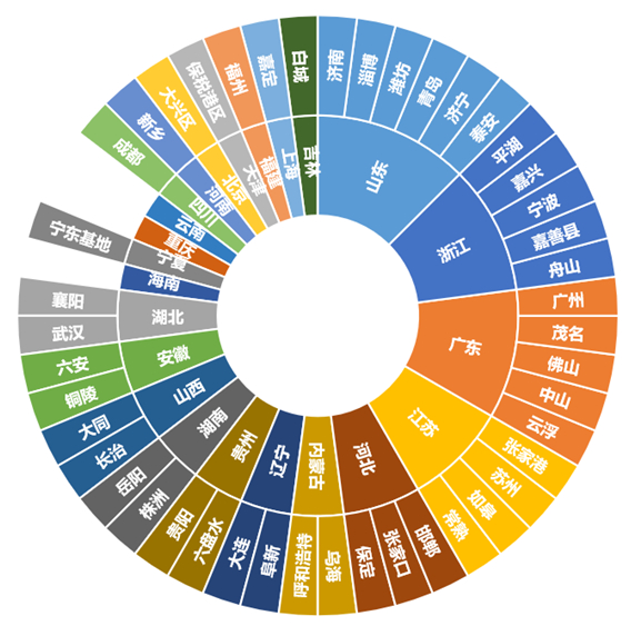 从各地支持的力度看,我国氢能发展支持力度最大的地区为珠三角、长三角、京津冀鲁等经济发达地区及市(县)。氢能的商业化发展适合从有一定经济实力基础的省市起步,广东、山东、江苏等地对氢能发展支持力度大、财政补贴金额多,这些地区前期氢能积累较多、也是氢能快速发展应用的地区。