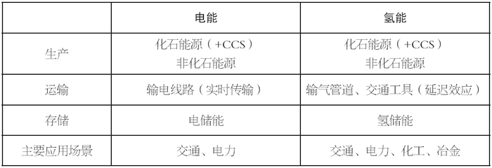 氢能是一种来源广泛、清洁灵活、应用场景丰富的二次能源。同属于二次能源的氢能和电能,均可以存在于能源生产、存储、输送和消费的各环节,表1所示是电能和氢能的定性对比分析。从生产的角度说,电能和氢能均能以化石能源(+CCS)、非化石能源作为原料制取;从运输的角度说,电能通过输配电网进行实时传输,氢能通过输气管道、陆/海运输方式进行输运;从存储的角度说,电能和氢能都可以进行存储。从消费的角度说,电能和氢能均可以在交通、电力领域进行应用,是具有能源属性的。然而,氢能还有电能无法替代的原料及燃料属性,可以应用于化工和冶金领域,也就是说,氢能和电能最大的区别在于氢能是具有物质形态的二次能源。这也就决定了在未来高比例可再生能源系统中,氢能可以作为清洁电力的有力补充,在能源领域发挥独特的优势。