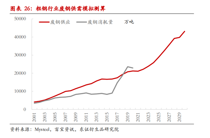 根据钢铁行业十四五规划,计划推动产业链、供应链多元化,铁、锰、铬等矿石资源保障能力显著增强,其中铁金属国内自给率达到45%以上,国内年产废钢资源量达到3亿吨。根据现有废钢供应模型(0.14*即期粗钢产量+0.5*20年前粗钢产量),2020-2025年期间,废钢供应量每年以1000-1500万吨增幅增长,2025年之后每年供应增速增加3000-4000万吨。