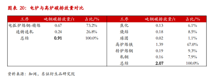 同样假设铁水和粗钢在当前的9亿吨和10.56亿吨见顶,电炉钢每增加1000W,即可减少碳排放0.1亿吨。假设国内电炉产能在2025年增加至3亿吨,产能利用率从当前的70%提高至90%,则对应电炉钢产量增加1.58亿吨至2.7亿吨,对应减少碳排放量1.58亿吨。可见,相较于高炉炉料结构改善,电炉炼钢比例提高对碳排放减排效果更为突出。