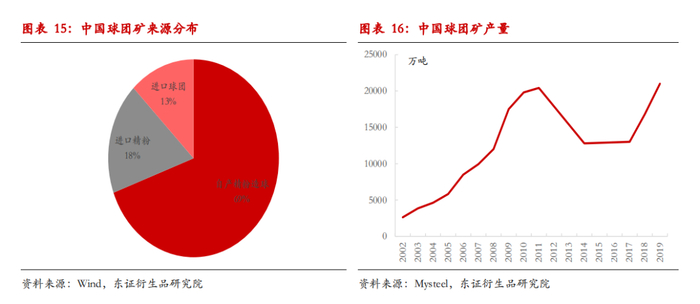 比例上,目前国内铁水中球团矿比例约17%,即1.5亿球团用量。1.5亿吨球团矿中,约70%来自于以国内精粉为原料的自产球团矿,18%来自于以进口精粉为原料的自产球团矿,13%来自于直接进口球团。全球球团可贸易量容量较小,2019年全球铁矿石贸易中,仅有8%为球团矿,即1.6亿吨。其中,中国进口球团3000W吨,占全球可贸易球团量20%左右。