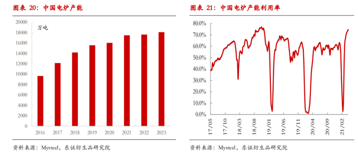 随着我国15-20年前的粗钢产量进入报废期,未来5年国内废钢供应量较为充裕。电炉钢长期产能增加,产能利用率提升,需要其冶炼成本曲线长期低于高炉。而在2016年电炉迅速发展以来,国内铁水-电炉成本整体呈现收敛态势,电炉成本优势尚不明显。电炉增产或需要更多政策扶持。