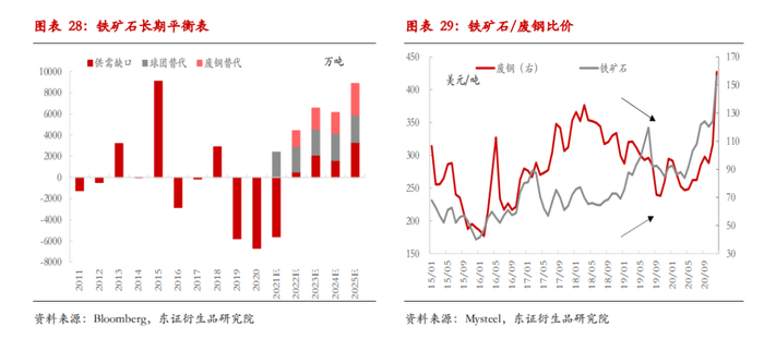 “碳达峰”背景下,高炉炉料对球团需求比例将大幅增加。铁矿石价格在2022年后面临供大于求格局,球团、废钢对粉矿的替代将加速粉矿过剩幅度,但球团和精粉等溢价将长期扩大;炉料结构改善叠加国内高炉大型化推进,焦比预计自然下降。电炉替代高炉需要同时具备废钢供应大增+成本优势,国内电炉比例提高需要更多政策支持。