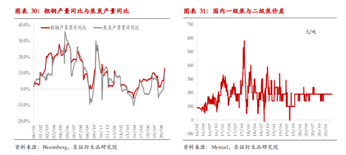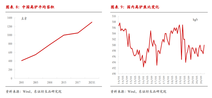 焦炭:伴随高炉炉料优化和整体焦比下降,焦炭长期需求面临增速下滑。假设铁水总量维持9亿吨,到2025年实现40kg/t的焦比下降即对应720万吨/年(9*0.004/5)的焦炭需求下滑。即,伴随焦比下降,长期焦炭需求增速将小于铁水产量总体增速。不过,伴随高炉炉料优化和高炉大型化,对焦炭强度等要求也在提升,高品质焦炭与低品质焦炭的结构性价差同样会持续扩大。
