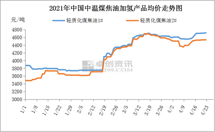 据卓创资讯数据显示,2021年至今,国内轻质化煤焦油1#均价为4232.62元/吨,较去年同期减少440.13元/吨,或跌幅为9.42%;轻质化煤焦油2#均价为4027.29元/吨,较去年同期增加100.33元/吨,或增幅为2.49%。2021年至今,国内轻质化煤焦油1#均价最高值出现在4月21日,为4717.78元/吨;最低值出现在1月26日,为3735元/吨。轻质化煤焦油2#均价最高值出现在3月15日,为4697.5元/吨;最低值出现在1月1日,为3485.71元/吨。