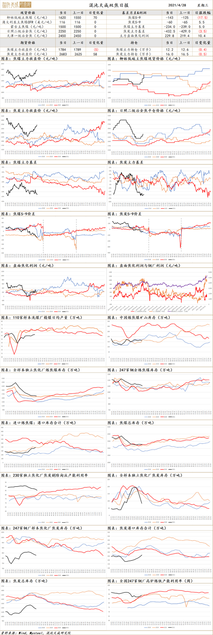 供应方面,MS调研上周国内平均吨焦盈利为374元,独立焦化厂产能利用率周环比减少1.36%至85.51%,钢厂焦化厂产能利用率周环比下降0.62%至87.89%,日均产量减少,MS调研数据显示本周焦化厂焦炭库存周环比下降42.07万吨至84.13万吨;盘面焦化利润大幅下跌,回归合理范围,焦企第二轮提涨基本落地;需求端,工信部对于粗钢产能的压减,叠加环保限产停产因素,焦炭的需求下滑,但停产情况较前期稍有阶段性好转,上周高炉产量反推日均焦炭需求为120.78万吨,而焦炭实际日均产量为117.34万吨,焦炭供需面有所收紧。山西部分焦化厂出现限产情况,叠加五一假期前的补库需求,短期焦炭稳中偏强,而长期需求量偏弱,且随着新产能陆续投放,预计下半年焦炭价格偏弱。