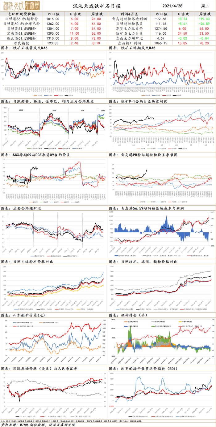 需求端,随着五一假期临近,钢厂仍有一定的采购补库需求,叠加钢材高利润情况下,非限产区域钢厂生产积极性高涨,当前市场对主流中高品铁矿的需求依然旺盛,高低品价差扩大至历史高位,结构性供需矛盾突出,近日港口现货成交表现尚可,美元货成交量基本与前期持平,目前落地利润依然为负,显示国外需求仍强于国内。
