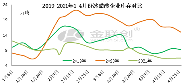 而今年上述因素的演变则更为凸显。供应面,顺达装置从1月16日意外停车后,到目前仍未能重启。此外伴随其他装置的意外停车,如2月份的华鲁、安徽华谊,3月份的天津渤化永利、安徽华谊、扬子乙酰,4月份的南京BP及索普大装置。金联创预估1-4月份供应损失量大约在42万吨,企业库存也长期处于低位,平均在9万吨左右的水平,4月份更是低至6万多吨。
