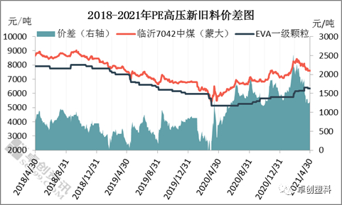 2018年至今,再生高压价格先震荡下滑后小幅回升。以EVA一级颗粒为例,2020年4月份突破历史最低点,降至5150元/吨左右,最高点为2018年年初的8100元/吨,高低价差在2950元/吨。进入2021年,受利好支撑,价格回升,截至4月底,为6350元/吨左右。