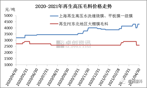 废塑料被禁止进口之后,国产废塑料几乎成为国内再生厂家唯一毛料采购渠道。由于国内回收体系尚未健全,毛料供应偏紧成为常态,价格居高不下。截至4月30日,上海地区水洗缠绕膜、平板膜一级膜主流商谈4300元/吨左右(出粒率在9.3-9.5成),较上月上涨150元/吨,较去年同期上涨1100元/吨。大连当地大棚膜主流收购价2600元/吨左右,出粒率在8.8-9.5成,较上月下滑300元/吨,较去年同期下滑100元/吨(备注:当地收购的废旧大棚膜一年一换类价格偏高)。近几年,再生厂家生产面临较高的生产成本,在新料价格持续下滑,跌至5300-5600元/吨,新旧料价差仅在100-300元/吨,甚至倒挂的时候,再生料价格承压,但再生厂家受成本影响,调价意愿较低,会出现主动关停现象。