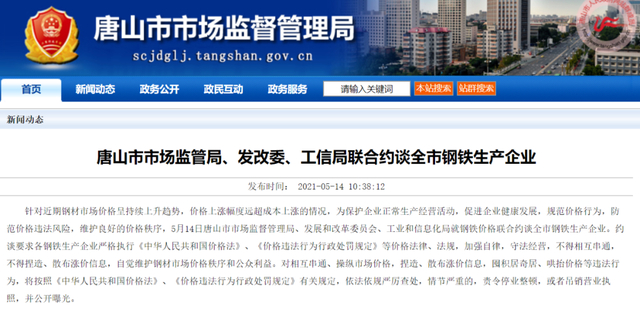 不过,5月14日市场出现变化。当日,上海、唐山两地的市场监管等部门约谈本地的钢铁企业,要求钢铁企业切实加强价格管理,合理制定价格,维护钢材市场价格秩序和公众利益。
