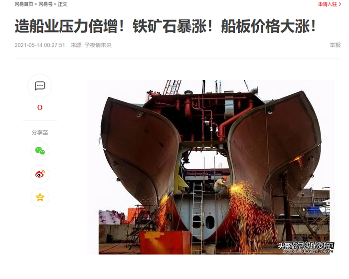 对于造船行业来说,其新船订单周期一般为1-2年,前年和去年承接的价格均是按照当时的船板价格核算的成本商定价格,目前船板价格较接单时涨幅达到50%左右,前期订单出现大面积亏损,原料采购意愿谨慎。