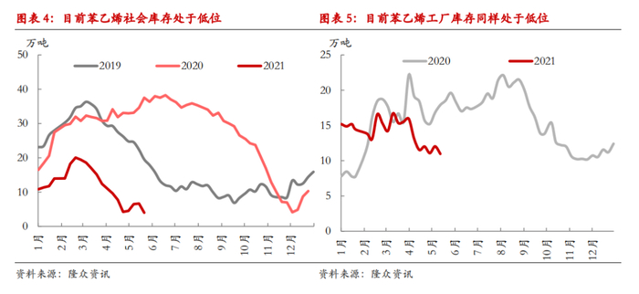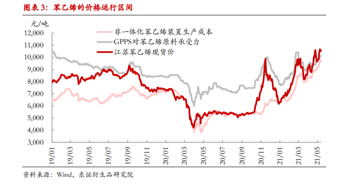 调研结论2.1、苯乙烯产业链库存确实处于低位根据调研情况来看,苯乙烯工厂库存处于低位、下游PS、EPS、ABS乃至UPR工厂的苯乙烯原料库存同样处于低位,苯乙烯近端可流通货源偏紧的状况在华北区域也得到明确验证。值得关注的是,苯乙烯下游工厂的产成品库存也处于偏低水平。具体来看,ABS工厂仍是客户排队等货的状况;EPS工厂今年有意压低了产成品的常态库存;PS工厂在部分透苯装置停车之后,更是几乎没有存量库存。苯乙烯下游工厂的原料库存和产成品库存处于低位,意味着即便下游对高价货源持谨慎态度,但整个产业链已经没有办法通过消耗存量库存来对抗原料价格的上涨,五一假期之后EPS等下游订单的阶段性转暖在某种程度上体现了脉冲式刚需补库的力量。2.2、下游对高价原料略有抵触情绪,但实际发生负反馈的仅在GPPS领域在调研过程中,下游工厂普遍提及了靠近终端环节对高价原料的抵触情绪,如PS工厂直观感知透苯超过1万元/吨面临销售阻力,ABS工厂也提及下游客户对1万8以上的ABS有抵触心理。值得关注的是,直观感知到的抵触情绪并不等同于当下实际的需求损伤,下游有抵触情绪的症结在于存量订单的加工利润受损,这对于订单周期较长或是定价权较弱的产业环节尤为明显。对于产能略有过剩的更下游加工工厂而言,无利润无订单才会考虑停产。截至目前,苯乙烯下游实际发生负反馈的仅在透苯领域(GPPS),绝大多数下游的价格传导虽有阻力,但整体在缓慢进行中。2.3、GPPS的需求萎缩可能源于再生料替代,而不是终端需求的转势自4月下旬以来,透苯是唯一对于高价苯乙烯原料表现出负反馈的领域,部分透苯装置因持续亏损而停车。在华北调研过程中,我们直观感知透苯需求的萎缩可能源于再生料的替代,而不是外墙保温材料等终端需求的转势。在XPS挤塑板领域,以往也会有再生料混的情形。去年同期新料价格普遍较低,透苯新料对再生料有替代(新料与再生料价差收窄至1000元/吨以内时,企业会更倾向于选用新料),今年GPPS新料价格强势上涨,相对而言,每吨8000多元的再生料重获价格优势,于是边际上再生料对GPPS新料出现了新一轮替代。对比外墙保温加工企业对EPS需求并没有明显收缩的情况来看,外墙保温等终端需求暂时并没有转势,GPPS的需求萎缩更可能是源于再生料替代。即便有价差的驱动,再生料对新料在挤塑板领域的替代也并非没有上限,考虑到生产稳定性以及产品品质等问题,再生料的替代只是掺用而不能完全替换。部分PS装置停车以来,社会库存不断被消化,边际上有利于PS领域原料价格的向下传导。2.4、传统需求旺季背景下,下游正在逐步接受原料价格的上涨2020年11月也曾发生过苯乙烯下游对高价原料抵触甚至发生需求端负反馈的情况,但今年经过一段时间的僵持之后,下游有逐渐接受高价原料的迹象,其中最重要区别在于时点不同,去年11月临近需求淡季,下游工厂利润受损之后主动调整生产,而目前正值传统需求旺季,建材与包装等终端需求表现出韧性,下游工厂经历了消耗存量库存之后开始被动接受原料价格的向下传导。2.5、苯乙烯产业长期发展的症结在于纯苯端华北地区苯乙烯区域格局的变迁也部分反应了苯乙烯产业发展趋势。在2020年之前,华北区域属于苯乙烯净流入地,可以部分吸收山东货源;自2020年11月新增30万吨苯乙烯产能之后,华北区域基本区域均衡;如果今年年内新增45万吨产能顺利投产,则可能阶段性成为净流出地,余量货源可能发往华东等地;2022年之后也会有EPS、PS等下游装置陆续投产,区域内消化能力则可能会再度增强。值得关注的是,近年来的新增苯乙烯扩能多数需外采纯苯,然而全球范围内的新增纯苯外销量非常有限,根据华北地区对焦化行业的产业政策来看,煤化工路线的加氢苯新增扩能与产能利用率提升都非常有限。苯乙烯产业长期发展的症结可能在纯苯端,产业链上下游博弈利润时也可能是上游纯苯端占优。投资建议结合调研情况来看,目前无论是苯乙烯工厂库存还是下游工厂的原料库存都处于低位,苯乙烯产业链的库存低位至少将持续至5月底,可流通货源持续偏紧短期内仍将支持苯乙烯现货偏强运行。此轮苯乙烯价格上涨过程中,下游对高价原料略有抵触情绪,但实际发生负反馈的仅在透苯领域,通过草根调研来看,透苯需求的阶段性需求萎缩更可能源于再生料替代,而不是终端需求的转势。在终端需求保持韧性、当前又处于传统需求旺季的背景下,下游正在逐步接受原料价格的上涨。总体来看,高价苯乙烯原料对下游需求有所损伤,目前主要体现在制品单位用料缩减和再生料的替代,整体损伤幅度暂不大,考虑到原料价格的向下传导已经在缓慢进行,后期缓解苯乙烯货源紧张的关键还是在于供应渐增的速度。此外,近期苯乙烯产业利润收窄,纯苯端依然价高货紧,当前的风险收益比还不足以吸引空方力量的集结。短期内预计苯乙烯期价将继续偏强震荡,边际上建议重点关注如下边际变量:一是进口套利窗口再度打开能带来多少进口增量;二是纯苯端是否会引发需求端的负反馈。对于由强转弱拐点的把握,建议耐心等待苯乙烯与纯苯供需拐点的共振。