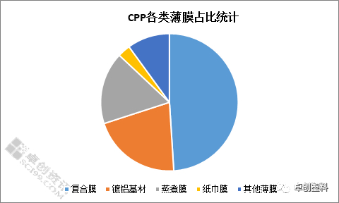CPP薄膜主要分为复合膜(GCPP)、镀铝基材(MCPP)、蒸煮膜(RCPP)三个应用大类,不同的薄膜因不同的性能应用于不同的领域。从占比来看,复合膜是CPP薄膜品种中相对低端的薄膜,也是比例最大的,占到近50%左右,但较前几年有下滑的趋势。近几年,低端薄膜正在寻求改进,比例正在减少,镀铝基材、蒸煮膜的比例呈小幅扩大的趋势。