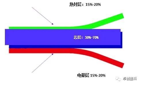 CPP薄膜的三层共挤流延膜结构一般可分为热封层、芯层、电晕层三层。可单独选择满足各层要求的材料,以赋予薄膜以不同的性能和用途。其中热封层要进行热封合加工,要求材料的热封温度低、开口性好,常用聚丙烯三元或二元为主,占薄膜比重的15%-20%;芯层材料决定了薄膜机械性能,均聚聚丙烯占薄膜比重的60%-70%,一般普通拉丝就能达到要求;电晕层经过表面电晕处理后具有适当的表面张力,以便进行印刷、复合或金属化处理,该层材料对助剂的添加有一定的要求以薄膜的表面润湿张力,一般二元料为主,占薄膜比重的15%-20%。