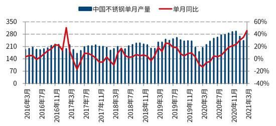 2021中国不锈钢产量仍维持高位。据SMM数据,2021年1-3月中国不锈钢产量806万吨,一季度累计同比增44%,预计4月份产量293万吨。展望5月份,海外疫情严峻导致的外贸订单转移的逻辑仍没有改变,同时国内正值消费旺季,预计国内不锈钢产量仍环比仍有一定程度的增长。