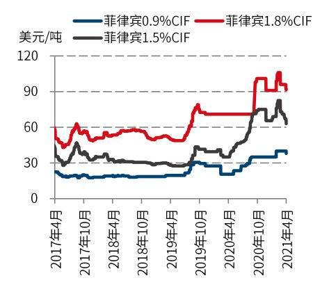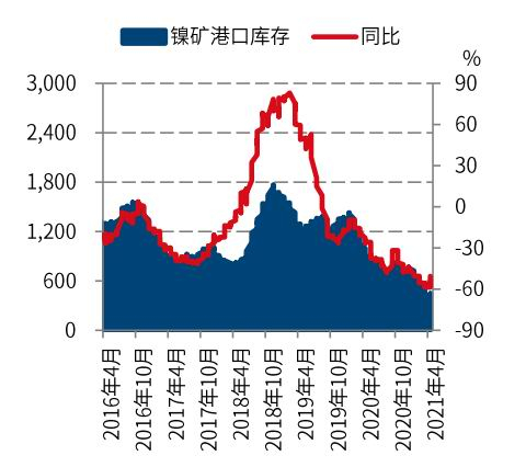 港口库存量仍处低位。4月份国内镍矿港口累计数量不及预期,主因系菲律宾雨季期间出口量大幅减少,叠加因菲律宾输入新冠肺炎病例增加,包括连云港(601008,股吧)在内的港口加强检疫政策,镍矿进口周期也相对延长。据中联金统计,2021年4月23日国内12个主要港口红土镍矿库存约475.5万吨,较4月9日减少8万吨。去年同期库存约972万吨,同比减少496.5万吨。考虑到疫情的不确定性,以及铁厂为菲律宾雨季积极备货的需求,镍矿市场仍然供不应求,对镍矿价格形成一定支撑力。进入五月份,菲律宾将陆续恢复镍矿出口,但考虑到疫情的不确定性,该国的出口仍不容乐观。