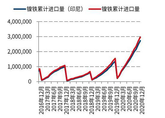 印尼镍铁增量弥补国内缺口。随着2020印尼新增镍铁企业的密集投产、达产,该国镍铁产量大幅增长,2020年反超中国成为全球第一大镍铁生产国。据SMM数据,2020全年印尼镍铁产量将超过59万吨镍,累计同比超58%。在此背景下,中国镍铁进口量亦大幅增长。据海关数据显示,2020年全年中国从印尼进口镍铁37.5万金属吨,同比增100%。随着印尼镍铁产能投放的进一步加速,2021年进口量仍将存在较大增长。