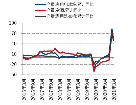 受益于海外订单激增,国内白电产量大幅升高。2021年1-3月,全国家用电冰箱产量累计同比增长54.6%;空调产量累计同比49.8%;家用洗衣机产量累计同比增长50.7%。随着国内经济的好转以及外贸订单的修复,国内白电产量累积增速创新高。进入二季度是国内外消费旺季,白电为代表的不锈钢终端消费有望再创新高。